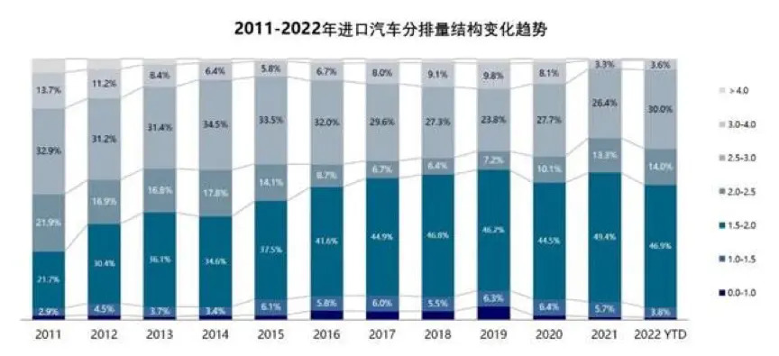 The 1.5-2.0L displacement range accounted for 46.9%, which was lower than that in 2021, but still maintained the largest displacement range; the supply of parallel imported models gradually resumed, and the share of displacement above 3.0L rebounded to 4.4%, which was significantly lower than that of 2021. 0.5 percentage point increase in 2021