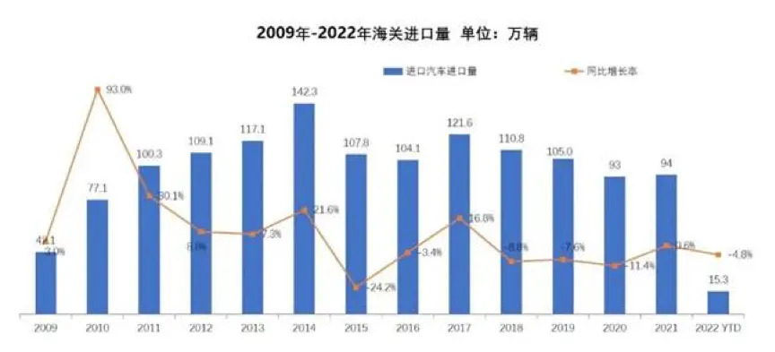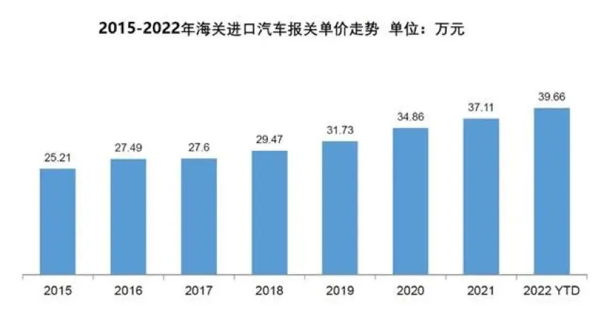 The customs declaration unit price of imported automobiles has increased year by year. From 2015 to 2022, the customs declaration unit price of imported automobiles has increased from 252,100 yuan to 396,600 yuan. One is the trend of consumption upgrading, and the other is the trend of localization of low-priced products.