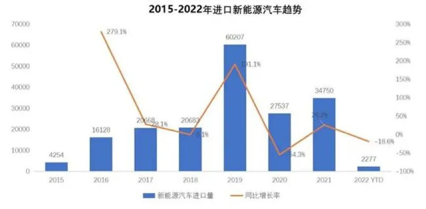 From 2016 to 2018, the sales of imported new energy vehicles were between 15,000 and 20,000 units. Driven by the Model 3, the sales of imported new energy vehicles surged to 60,000 units in 2019, a year-on-year increase of 191%, accounting for 30% of the total imported vehicles. 5.4%; with the domestic production of models, the sales volume will drop to 27,500 units in 2020. With the contribution of PHEVs, sales in 2021 will increase by 26.2% year-on-year. In 2022, NEV sales will be 2,277 units, down 18.6% year-on-year, mainly due to the decline in pure electric vehicles. 39.8%.