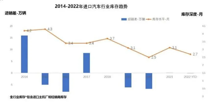 With the supply less than the demand in 19-20, the inventory depth of the imported automobile industry has declined significantly. In 2021-2022, supply and demand are basically balanced, but sales have declined, and the inventory depth has rebounded to 2.7 months. From a historical point of view, it is in a reasonable position. low level.