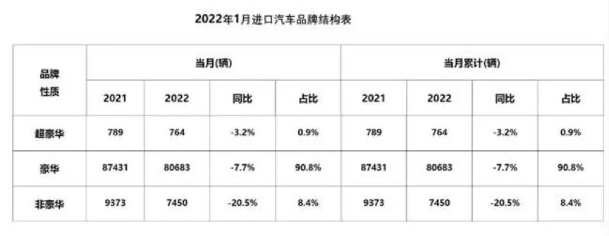 The consumption upgrade trend of imported cars is obvious. In January, the decline of luxury and ultra-luxury brands was significantly lower than that of non-luxury brands. “Luxury” continued to rise, and luxury cars accounted for more than 90%.