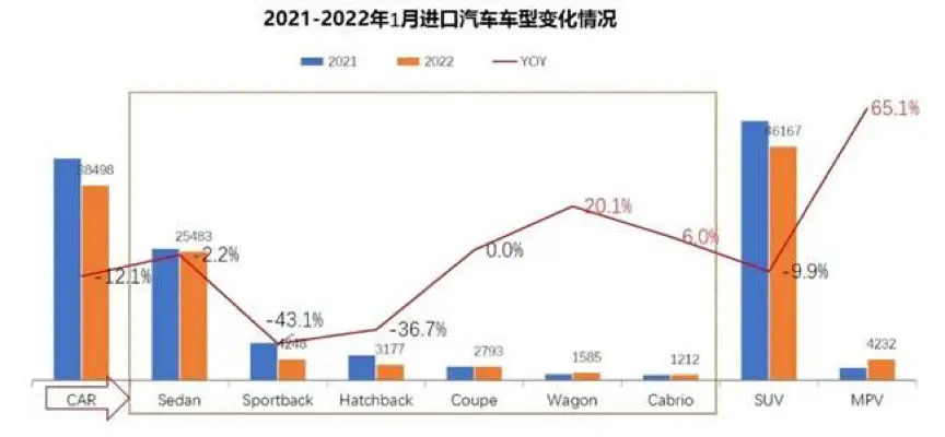 In January 2022, driven by the Senna, the year-on-year growth rate of MPVs reached 65.1%, while sedans and SUVs experienced a significant year-on-year decline; niche models outperformed the overall, highlighting the individual needs of the imported car market, and Wagon models saw a year-on-year growth rate Reached 20.1%, Cabrio grew 6% year-on-year